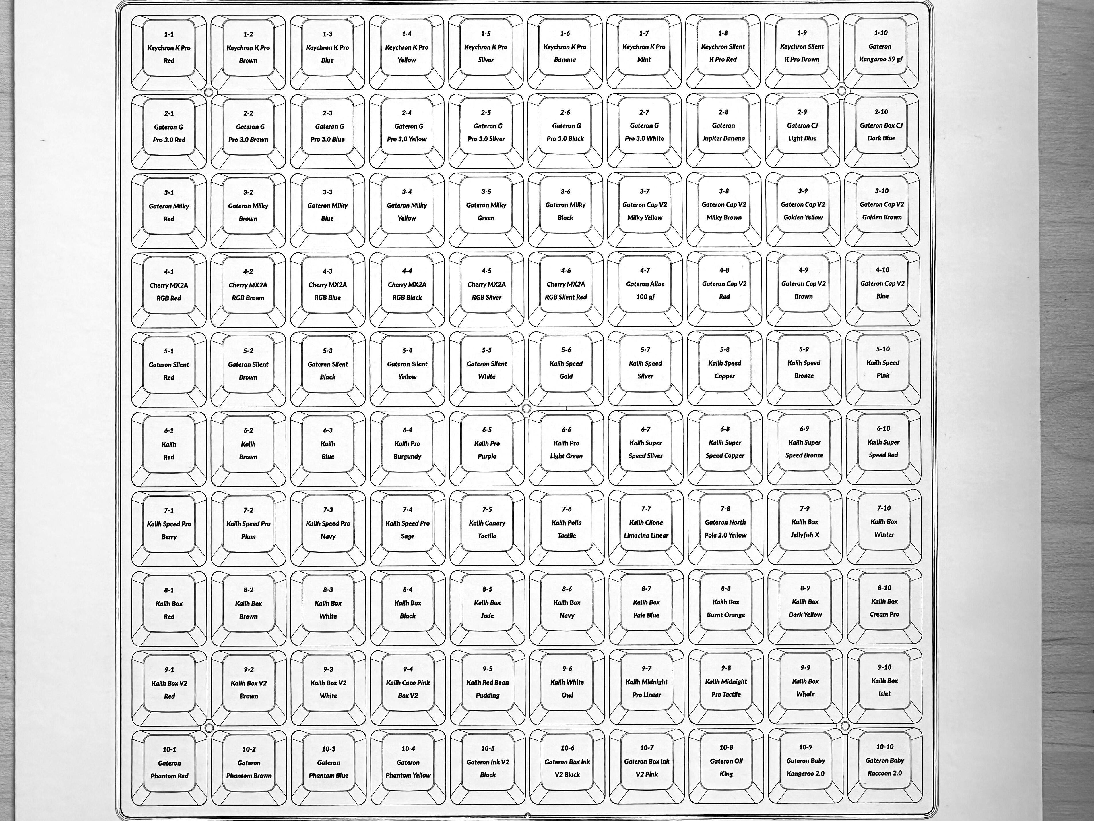 Each Keychron Switch Tester 100 Max Edition comes with 100 switches(including  9 Keychron, 6 Cherry, 41 Gateron, and 44 Kailh switches), transparent ABS Keycaps and the holder.