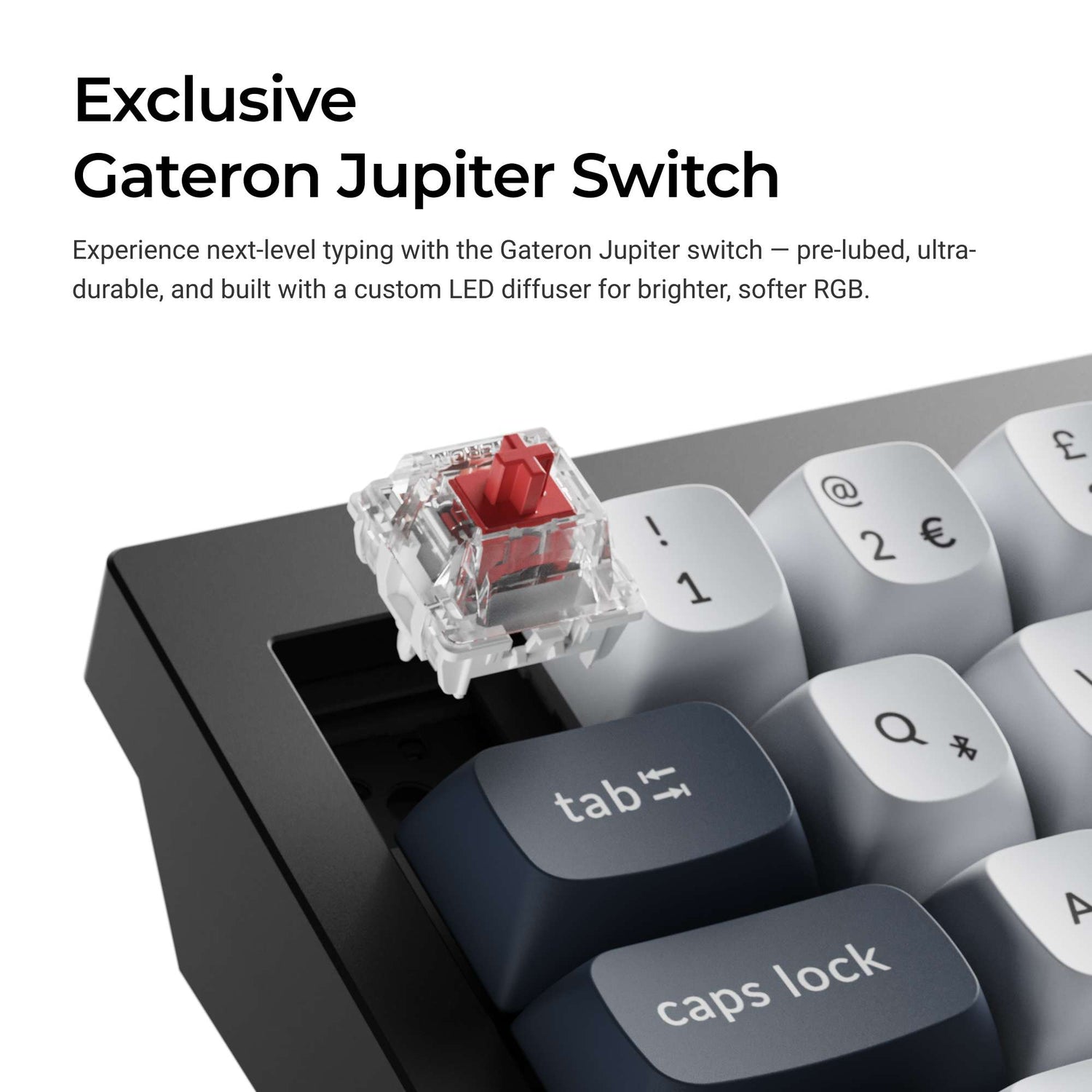 Our exclusive Gateron Jupiter mechanical switch (for the Fully Assembled version only) comes with a 3-pin design, its pre-lubed with a reliable Gateron quality standard with up to 80 million keystrokes lifespan. While their unique LED diffuser design offers high RGB backlight transmittance and softer backlight effect.