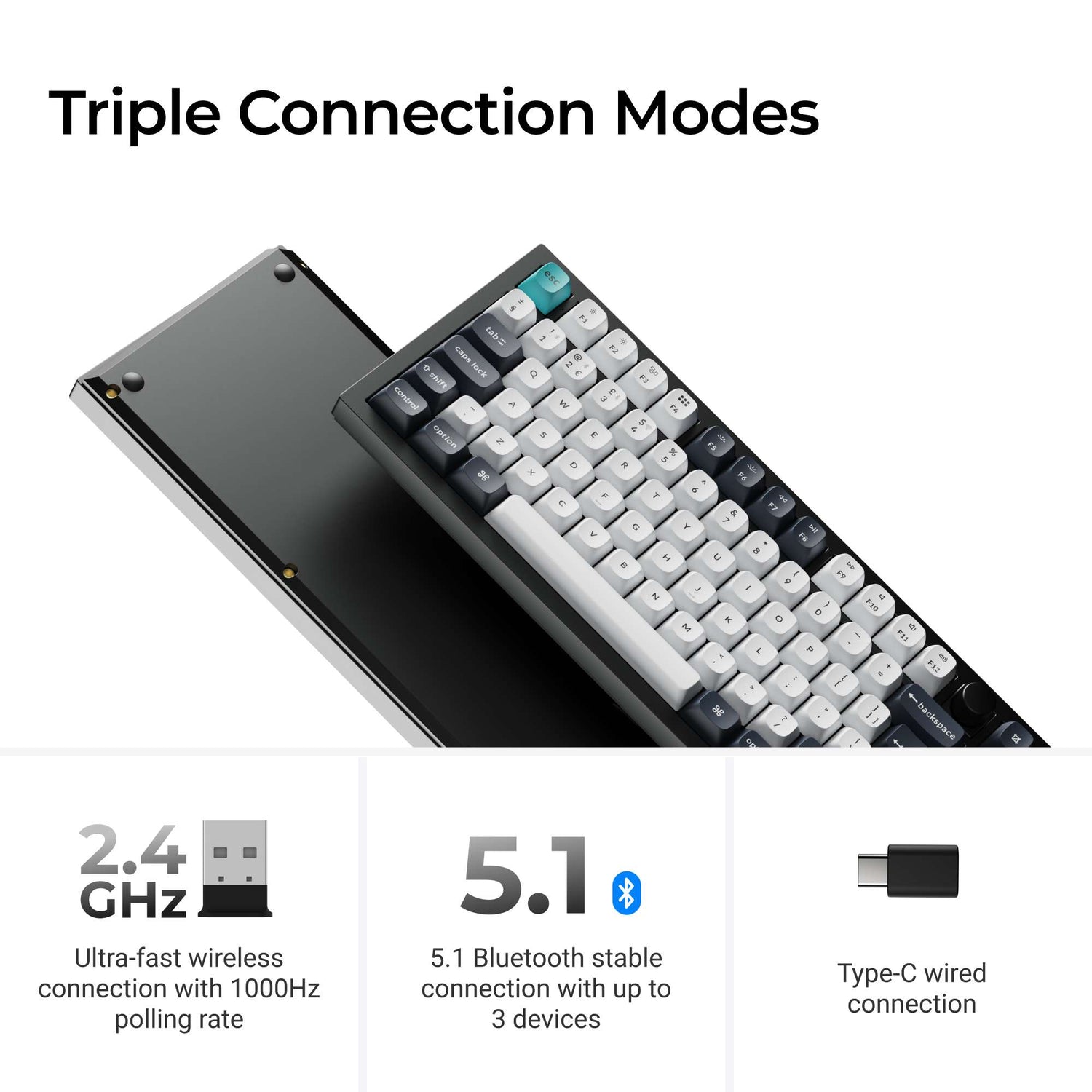 Discover enhanced performance with the Q3 Max Keyboard, featuring a 2.4 GHz wireless connection and a rapid 1000 Hz polling rate for responsive use. It also offers Bluetooth 5.1 connectivity, allowing easy and efficient multitasking by connecting with up to three devices, such as your computer, phone, and tablet, with quick switching capability.