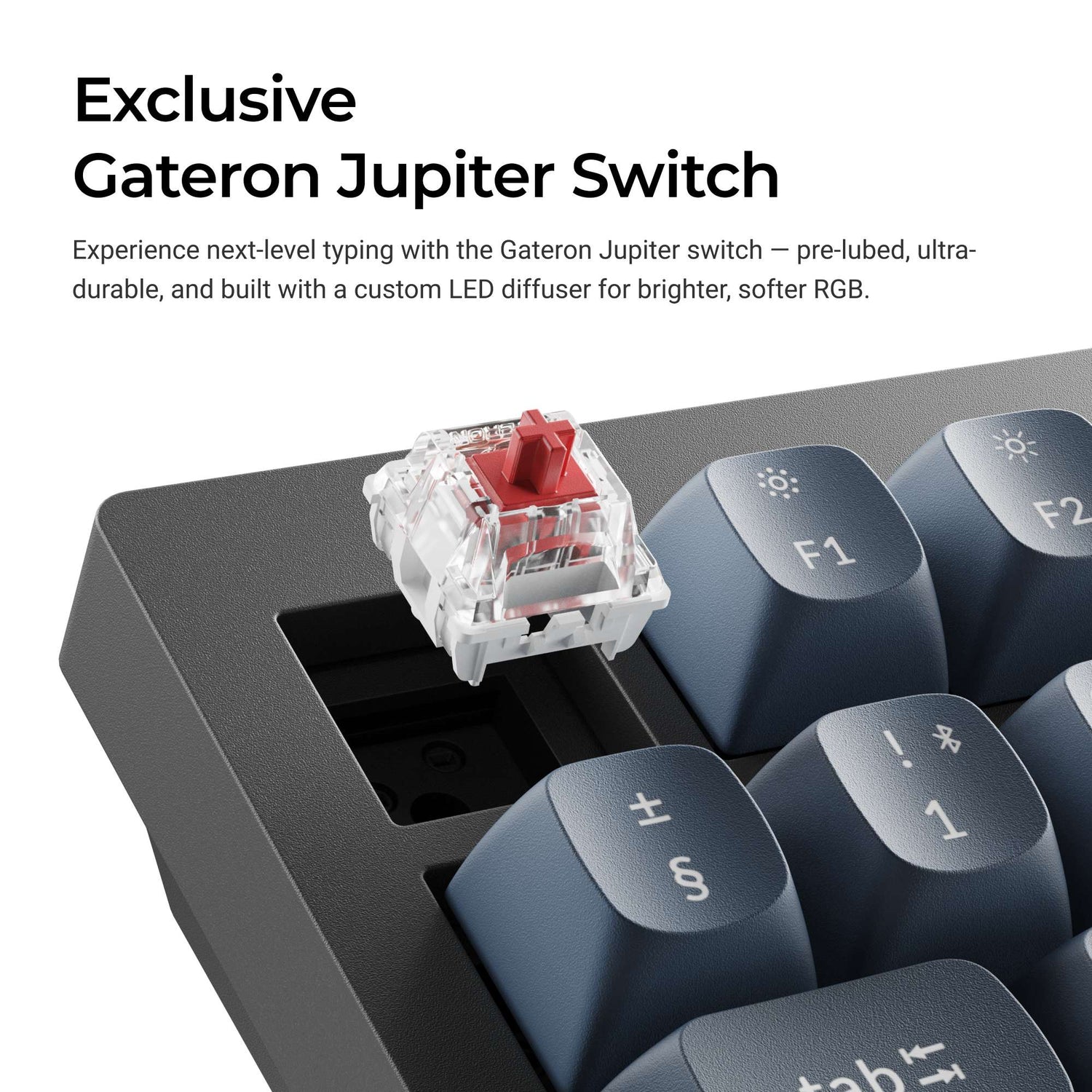 Our exclusive Gateron Jupiter mechanical switch (for the Fully Assembled version only) comes with a 3-pin design, its pre-lubed with a reliable Gateron quality standard with up to 80 million keystrokes lifespan. While their unique LED diffuser design offers high RGB backlight transmittance and softer backlight effect.