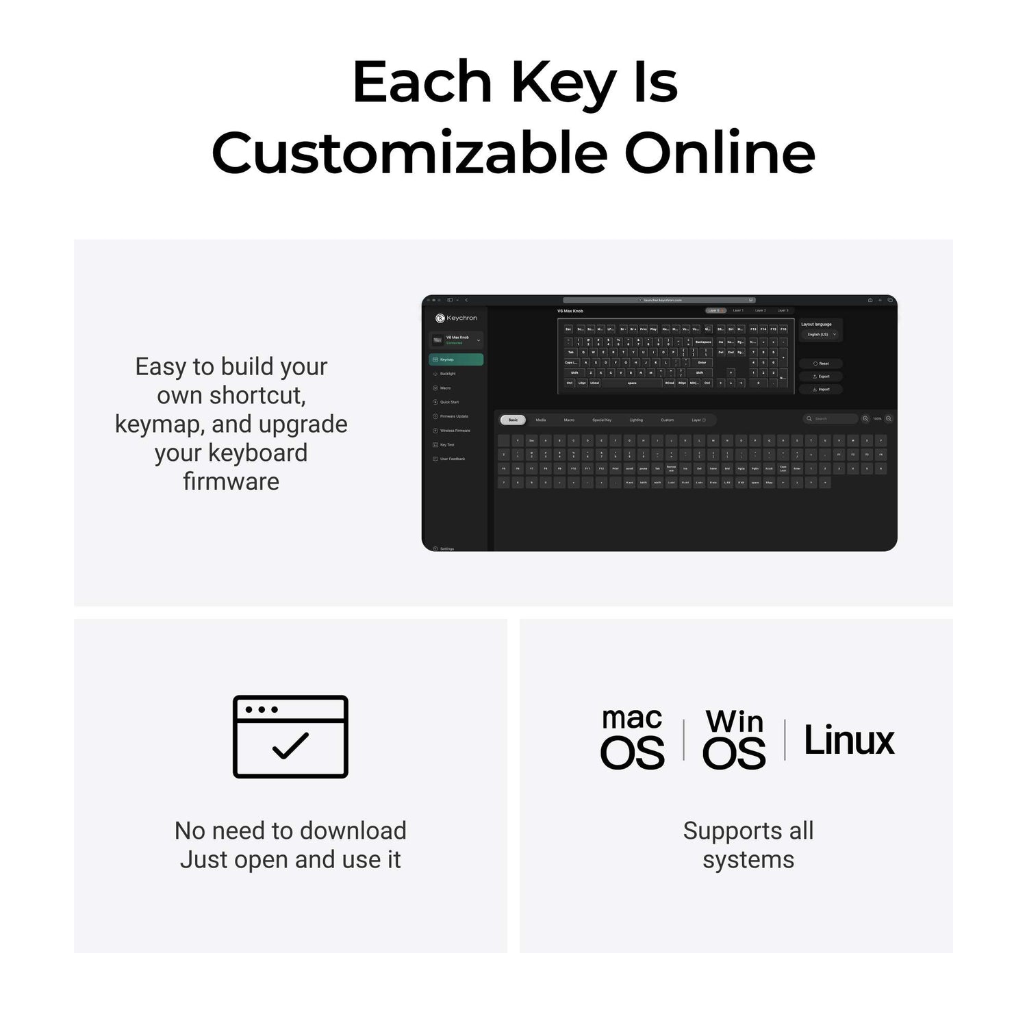 The open-source QMK firmware means endless possibilities for key remapping, macros, shortcuts, and more. Now you can easily customize each key with the Keychron Launcher web app.